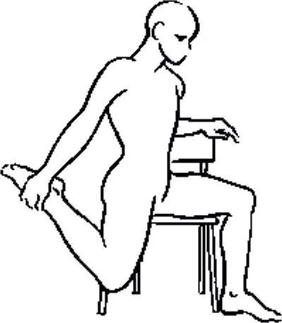 Растяжка: встаньте или сядьте на край стула. Согните ногу в колене и возьмитесь рукой за лодыжку (как это показано на рисунке). Отведите колено немного в сторону и подтяните ногу ближе к ягодице. Сохраняйте это положение в течение 15—20 секунд. Повторяйте упражнение несколько раз в день до полного расслабления.
